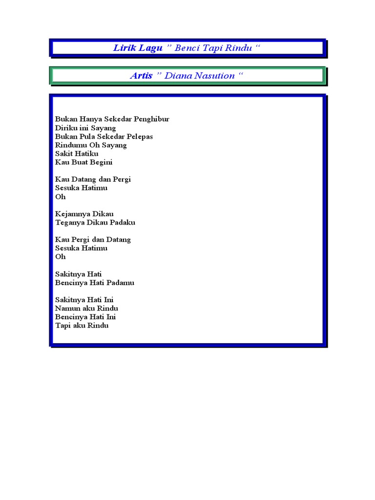 Download lagu Benci Tapi Rindu kan hanya bagi cara download gratis tapi tidak membuat lagu tersebut jadi lagu itu hak penciptanya dan bukan yang membagikan cara download gratisnya. Bukan hanya Sekedar penghibur Diriku sayang Bukan hanya Sekedar pelepas Rindumu sayang Sakit hatiku Kau buat begitu Kau datang dan pergi Sesuka hatimu Kejamnya dikau. Ooh kejamnya dikau teganya dikau padaku.